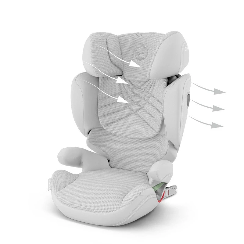 Le dossier du Solution T i-Fix s’incline pour s’adapter à tous les véhicules, s’ajuste sur 12 hauteurs selon la morphologie de son occupant, et entraîne simultanément l’élargissement au niveau des épaules. La conception du siège favorise la circulation de l’air et maintient une température agréable, quelle que soit la saison.