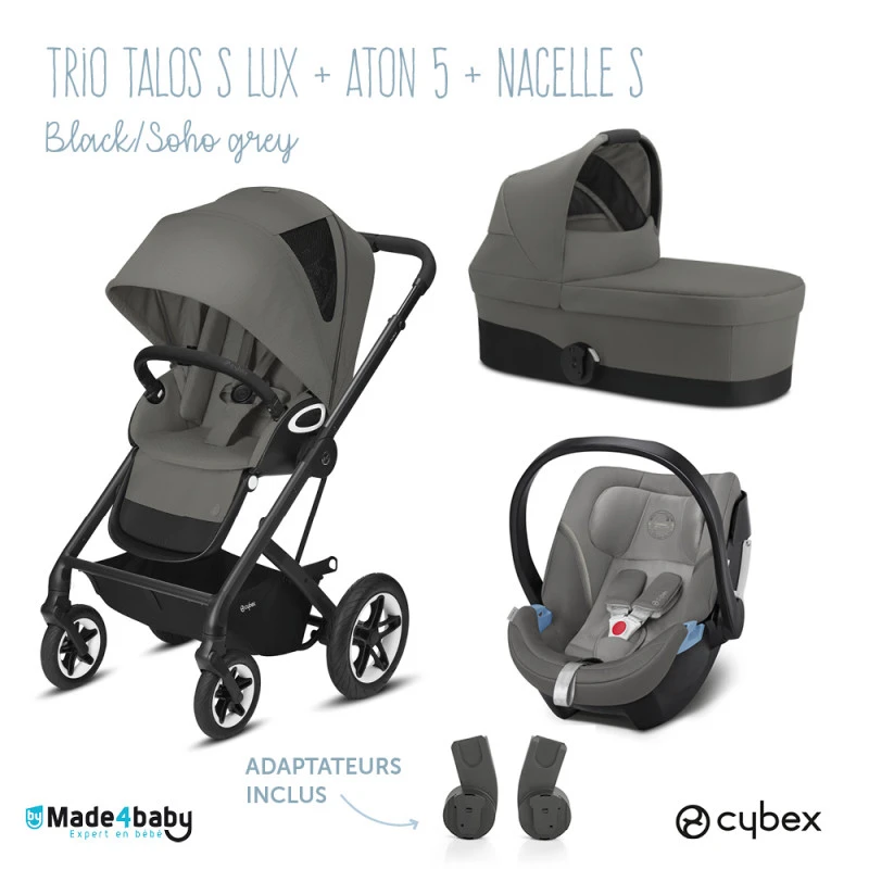 Cet ensemble trio est composé de la poussette Talos S Lux, du siège Aton 5 et de la nacelle Cot S de Cybex !